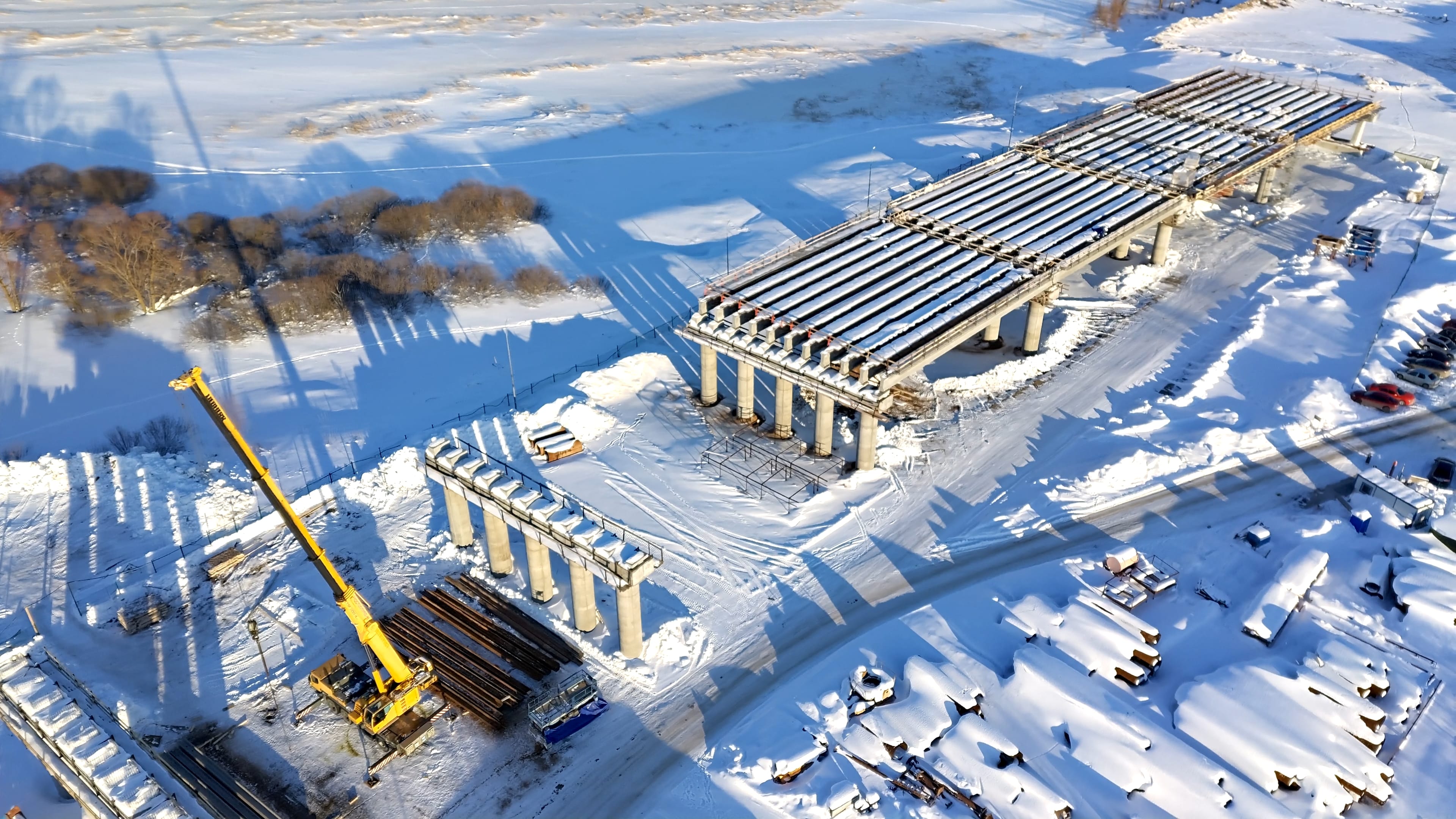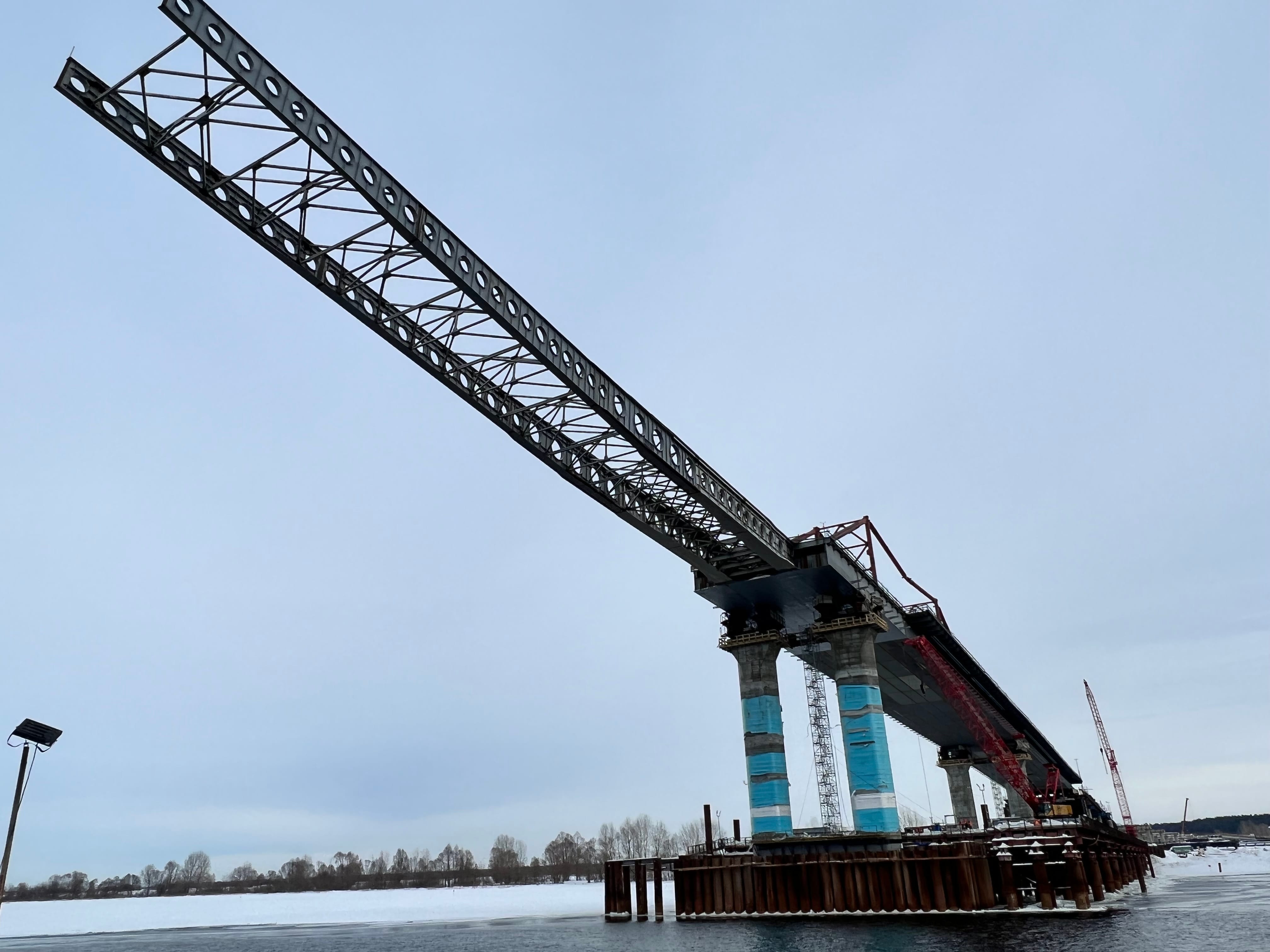 На участке также продолжается укрупненная сборка металлических блоков пролетного строения моста. Надвижка всей металлоконструкции закончится в августе этого года, затем специалисты начнут опускание пролетного строения и приступят к устройству мостового полотна, монтажу искусственного освещения и барьерного ограждения.
