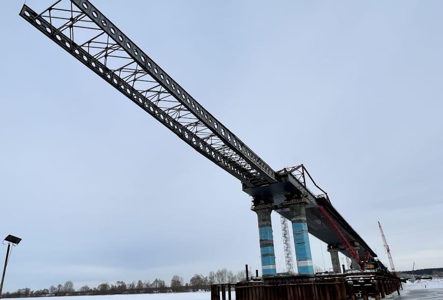 Кроме того, на 35 % выполнена надвижка пролета моста через Каму.  На седьмую, шестую и пятую опоры надвинули 270 м металлического пролетного строения. Общая протяженность пролетного строения русловой части составит 792 м, масса – более 11 тыс. т. Монтаж выполнили методом продольной надвижки, когда пролеты перемещают горизонтально строго по оси моста. Этот процесс проводится под контролем геодезистов, которые следят за возможным смещением металлоконструкции и в случае минимальных отклонений корректируют ее положение.